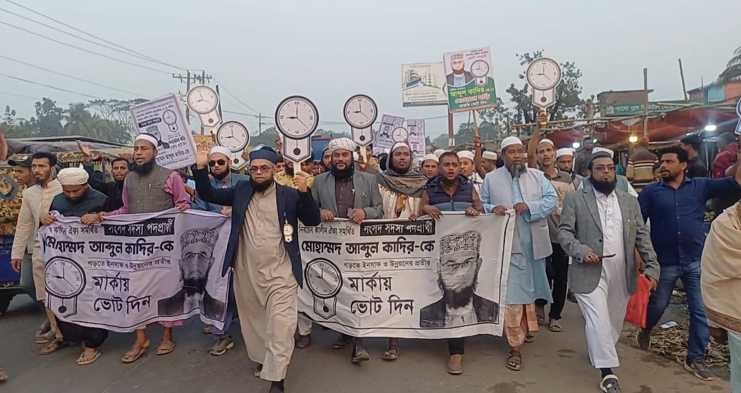 ছাতকের গোবিন্দগঞ্জে দেওয়াল ঘড়ি প্রতিকের সমর্থনে গণমিছিল ও নির্বাচনী সমাবেশ অনুষ্ঠিত হয়েছে। রোববার বাদ আসর গোবিন্দগঞ্জে মিছিল শেষে সমাবেশ অনুষ্ঠিত হয়। খেলাফত মজলিস ছাতক উপজেলা শাখার সভাপতি মাওলানা আবুল হাসনাতের সভাপতিত্বে গোবিন্দগঞ্জ চত্তরে সমাবেশে প্রধান অতিথির বক্তব্য রাখেন, ছাতক-দোয়ারাবাজার আসনের খেলাফত মজলিস মনোনীত ও ১০ দলীয় নির্বাচনী ঐক্য সমর্থিত সংসদ সদস্য পদপ্রার্থী হাফেজ মাওলানা মোহাম্মদ আবদুল কাদির। বিশেষ অতিথির বক্তব্য রাখেন, সংগঠনের সুনামগঞ্জ জেলা শাখার সহ সভাপতি মাওলানা ছদরুল আমীন, সাধারণ সম্পাদক মাওলানা আখতার হোসাইন, সহ সাধারণ সম্পাদক মাওলানা বুরহান উদ্দিন, মাওলানা নূরুল ইসলাম, আখতার হুসাইন আতিক, লন্ডন মহানগরী সাধারণ সম্পাদক মাওলানা জাবির আহমদ, সুনামগঞ্জ জেলা সাংগঠনিক সম্পাদক ফারুক আহমদ জাবেদ, ছাতক পৌর সভাপতি মাওলানা জহির আহমদ, দোয়ারা বাজার উপজেলা সভাপতি মাওলানা মঈনুল হক, ইসলামী আন্দোলনের এ আসনের সাবেক সংসদ সদস্য পদপ্রার্থী মুফতি হাফেজ হুসাইন আল হারুন, খেলাফত মজলিস ছাতক উপজেলা সাধারণ সম্পাদক মাওলানা জসীম উদ্দিন ইসলামি যুব মজলিস সুনামগঞ্জ জেলা শাখার সহ সাংগঠনিক মাওলানা আব্দুল ওয়াদুদ( লদু) প্রমূখ। এদিকে, হাফেজ মাওলানা মোহাম্মদ আবদুল কাদির এর দেওয়াল ঘড়ি প্রতিকের সমর্থনে বেলা ২টায় উপজেলার জাউয়াবাজার আর সাড়ে ৩টায় ধারণবাজারে পৃথক ভাবে মিছিল ও নির্বাচনী সভা অনুষ্ঠিত হয়েছে।